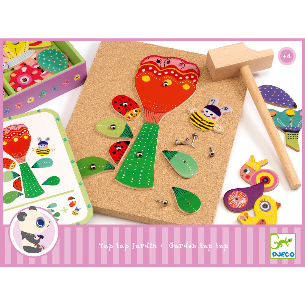 A montázs készítés az ovodás korú gyermekek egyik kedvenc foglalatossága. A meglévő elemek, anyagok, formák rögzítése egy adott alapon már a legkisebbeknek is sikerélményt nyújt. A montázs technika új mozzanata a Djeco képkirakó, alkotó játékában a kapcsokkal, vagy pici csavarral, életlen szögecsekkel való képrészek rögzítése. A Kerti képes képkészítő játék, montázs alkotó játék szögecsekkel rögzíti a parafa alaphoz a kép alkotóelemeit. Az alkotóelemek, virágok, falevelek, gyümölcsök, madarak festett fafigurák, amelyek a megfelelő helyen vannak átlyuggatva a rögzítéshez. A gyermek választhat a hívóképek közül, építhet ugyanolyat, mint ami a képen van, de az adott elemekből kirakhatja a saját kreatív alkotását, képét is. Az elemek attól függően mozgathatóak, mozdíthatóak, milyen szorosan rögzíti a szegecsekkel a parafa alaphoz a gyermek. Önkontroll gyakorlására, szem-kéz koordináció fejlesztésre, új ismeretek szerzésére ad alkalmat ez a bájos, kerti csendéleteket megjelenítő játék.