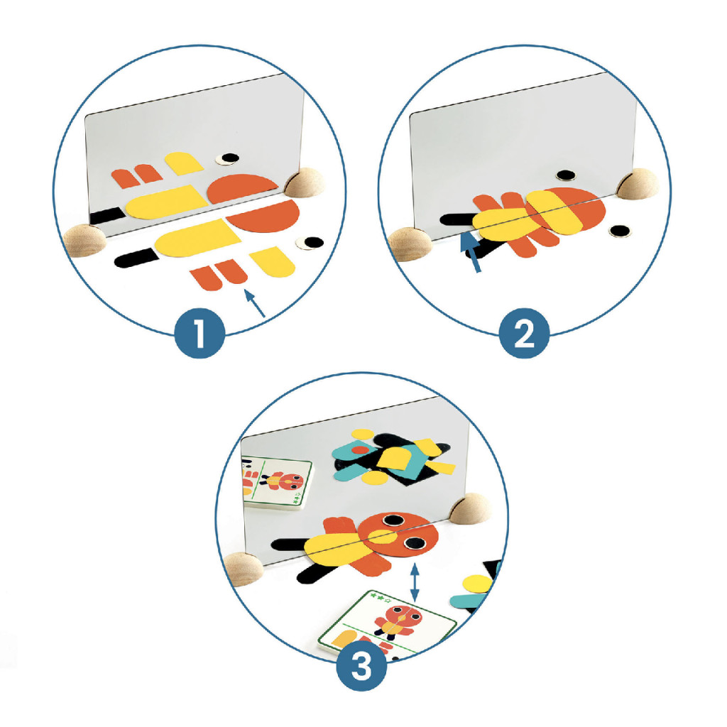 A Tükröző állatfigurák egy varázslatos képes játék! Ebben a tükröződést felfedeztető dobozban a gyermek a forma részeket a tükör alá helyezi, és addig rakosgatja, amíg ki nem rakja a kártyákon lévő képekkel azonos képek egyikét. Izgalmas felfedezések játéka.