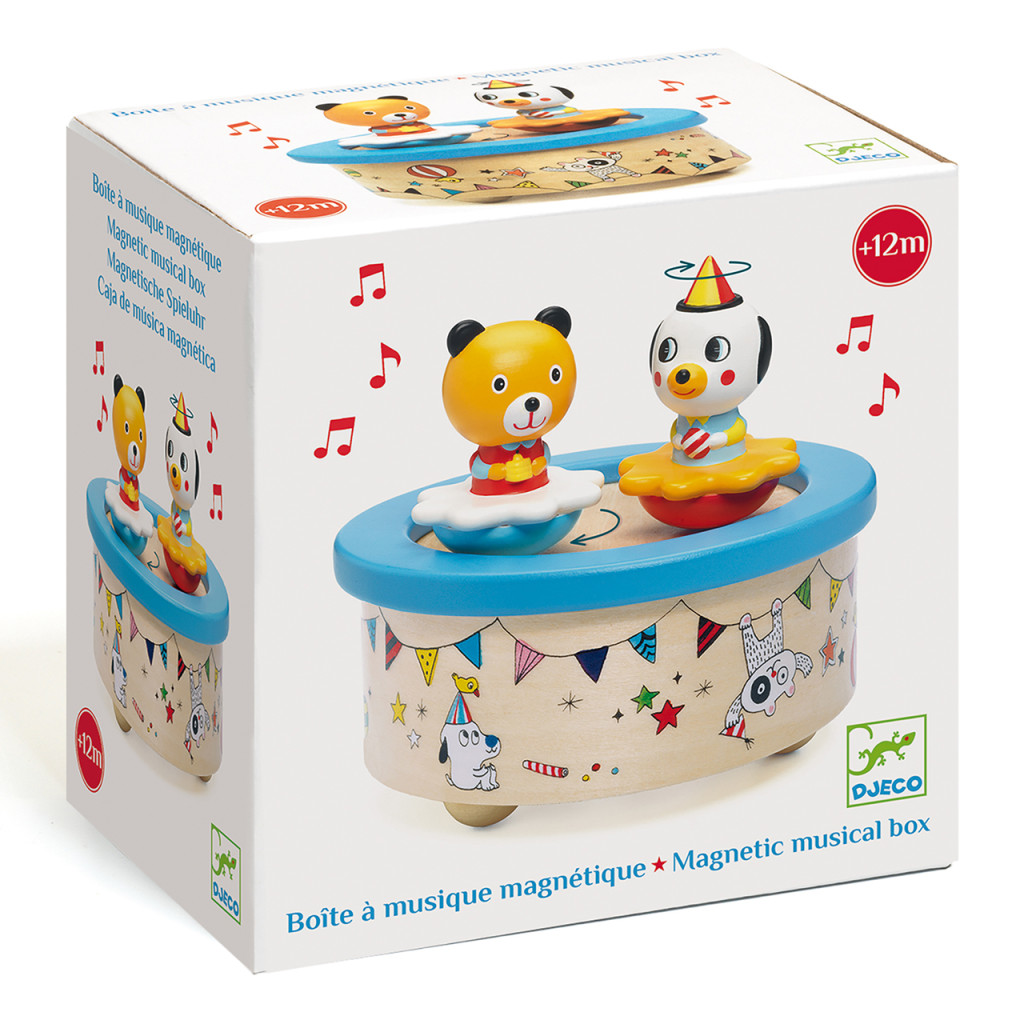 A két bájos babafigura Shubert Bölcsődalának dallamára forog a zenedoboz tetején. Zenére táncolnak, de önálló játékra is alkalmasak, ha éppen a kisgyermek babázni akar velük.