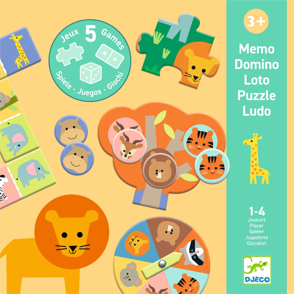 Egy komplett játékszett, mely 5 fontos és kedvelt oktatójátékot tartalmaz: memóriát, dominót, 12 részes kirakót, bingót és egy lépegetős társasjátékot. Ez a gyűjtemény remek szórakozás a gyerekek számára, miközben a logikai gondolkodást, megfigyelőkészséget, memóriát is fejleszti.